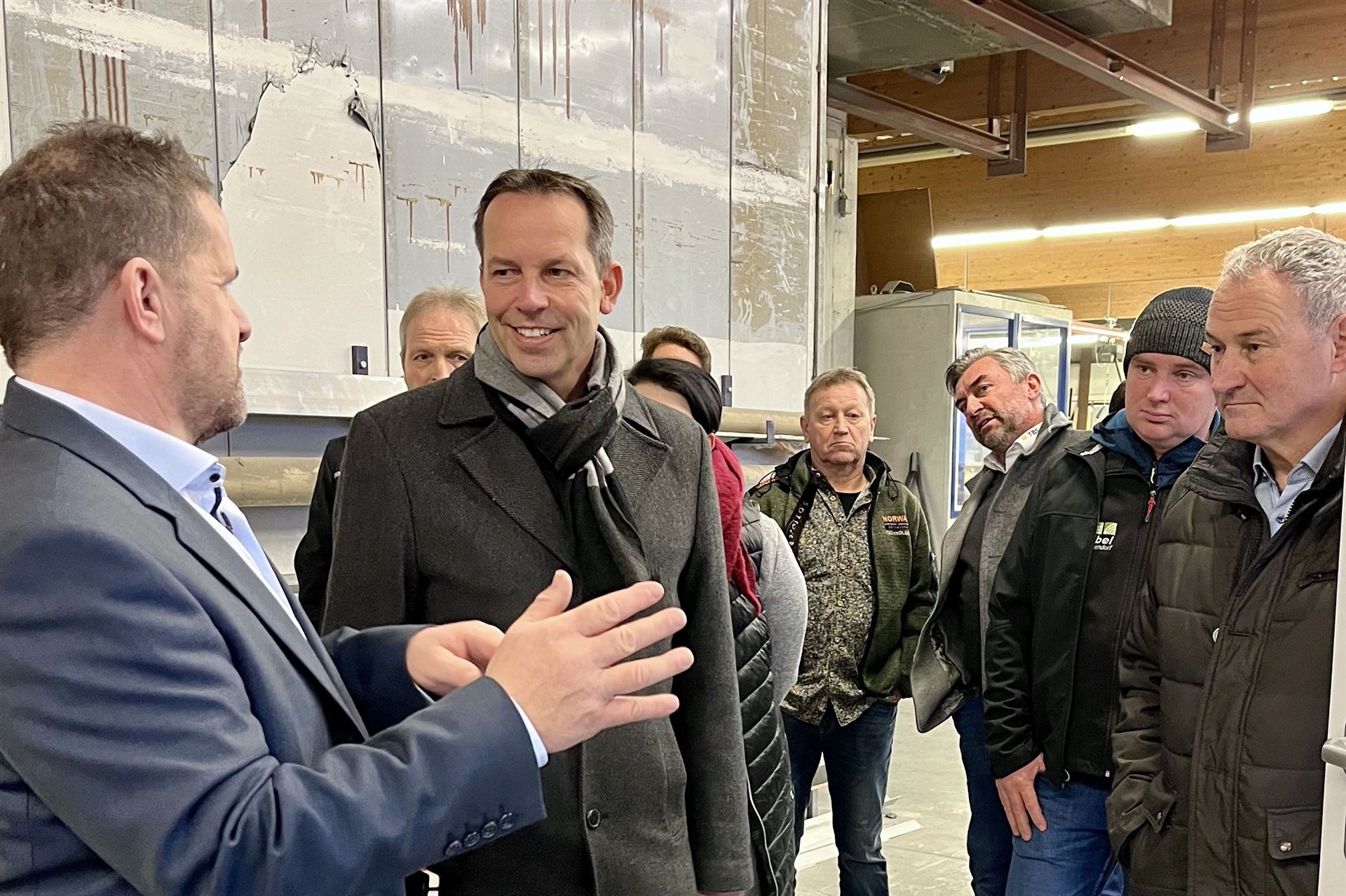 Gemeinsam mit Bürgermeister Guntram Grabherr sowie zahlreichen Gemeinderätinnen und Gemeinderäten wurde zunächst Station bei der Torbau Schwaben GmbH in Oberessendorf gemacht, die unter anderem hochwertige und vielfach individualisierbare Tore und Türen produziert. Am Beispiel des neu entwickelten AquaLOCK Garagenschwingtors, erläuterten die Geschäftsführer Roland Kaiser und Frank Landthaler die Innovationskraft des Betriebs. „Für uns als Mittelständler ist es wichtig zu wissen, dass die verantwortlichen Politiker sich auch direkt an der Basis informieren und sich nicht nur auf Informationen Dritter verlassen. Wir haben uns gefreut, dass Herr Dörflinger uns die Möglichkeit gab, zu zeigen, was wir können, und zu sagen, wo uns der Schuh drückt“, sagte Roland Kaiser, Geschäftsführer der Torbau Schwaben GmbH.