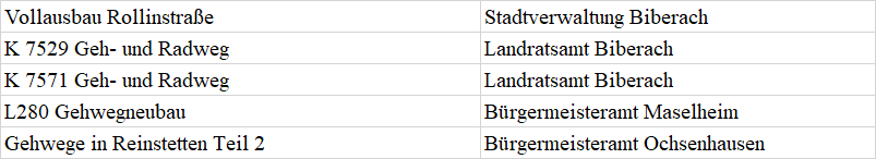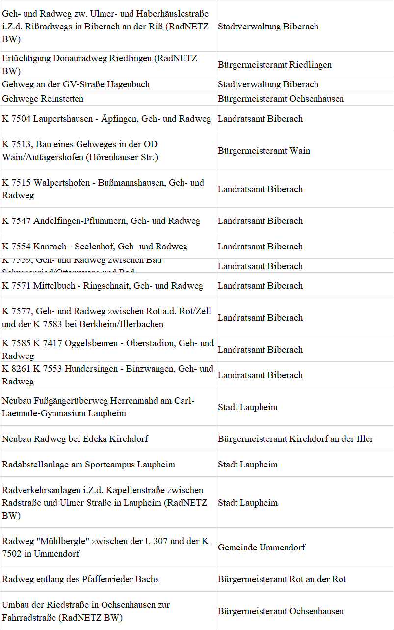 Laut Verkehrsministerium sind folgende Maßnahmen im Landkreis Biberach 2024 neu in das Förderprogramm kommunaler Rad- und Fußverkehrsinfrastruktur nach dem Landesgemeindeverkehrsfinanzierungsgesetz (LGVFG) aufgenommen worden: