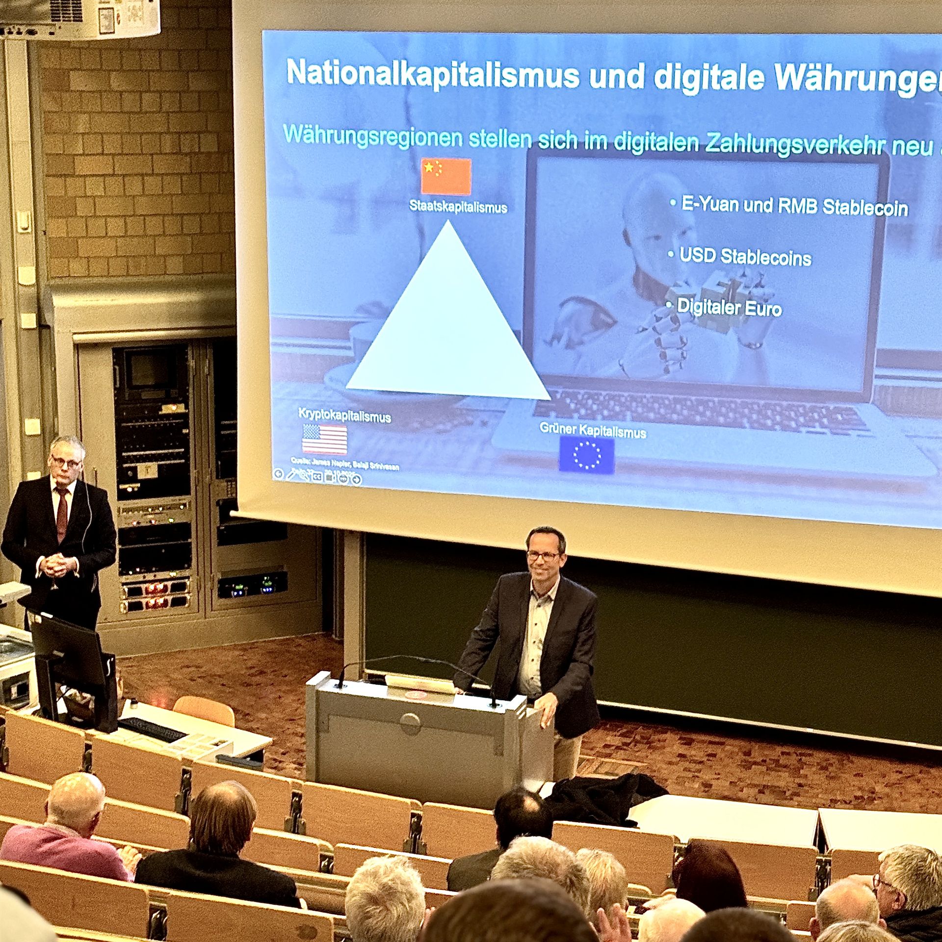 Im Mittelpunkt der Veranstaltung stand der Vortrag von Dr. Guido Zimmermann, Senior Economist der Landesbank Baden-Württemberg (LBBW), der unter dem Titel „Bitcoin und Co: Die Währung der Zukunft?" die zentralen Aspekte digitaler Währungen beleuchtete. Zimmermann erklärte, wie die Blockchain-Technologie funktioniert – ein System, bei dem Transaktionen ohne Bank oder andere Mittelsmänner direkt zwischen den Beteiligten ablaufen und dabei fälschungssicher aufgezeichnet werden. Besonders sei, so Zimmermann, dass eine Kryptowährung im Grunde ein Eintrag in einer Art digitaler Liste sei– vergleichbar mit einer riesigen Excel-Tabelle, die verteilt auf vielen Computern gespeichert wird. Anders als beim Euro, der durch Zentralbanken und Staaten gestützt würde, oder bei Gold, das einen physischen Wert hat, stünde hinter Kryptowährungen kein realer Gegenwert. Ihr Wert entstehe ausschließlich durch das Vertrauen und die Nachfrage der Menschen in Kryptowährungen. Zimmermann ging auch auf die wachsende Bedeutung von Kryptowährungen in der etablierten Finanzwelt ein und zeigte auf, dass immer mehr Unternehmen und Anleger diese neue Form der Geldanlage ernst nehmen. Gleichzeitig wies der Experte auf die Risiken hin: Starke Wertschwankungen, die Gefahr von Betrug und die Notwendigkeit, sich gründlich zu informieren, bevor man investiert.