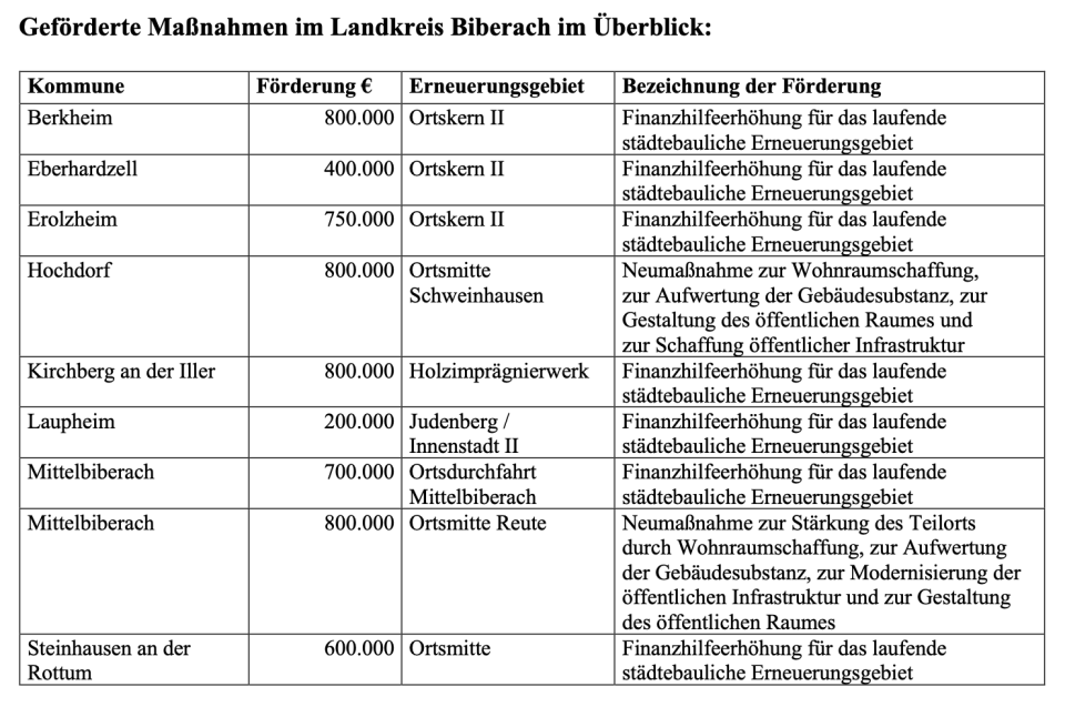 Das Land Baden-Württemberg unterstützt auch im Jahr 2025 zahlreiche Kommunen im Landkreis Biberach im Rahmen seines Städtebauförderprogramms. Insgesamt erhalten acht Städte und Gemeinden Fördermittel in Höhe von 5,85 Millionen Euro für Maßnahmen im Bereich der städtebaulichen Entwicklung.